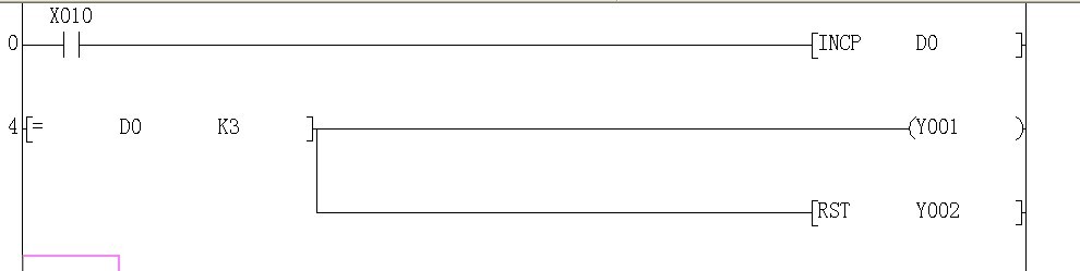 上圖的意思是X10每接通一次D0的值就增加1,當(dāng)D0的值等于3時(shí)候Y1 ON,將Y2復(fù)位。