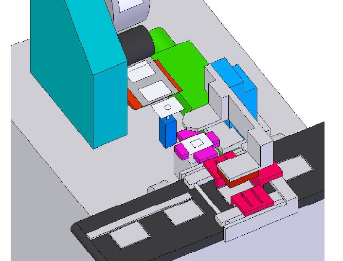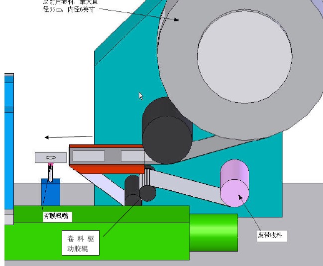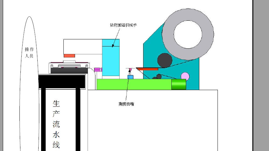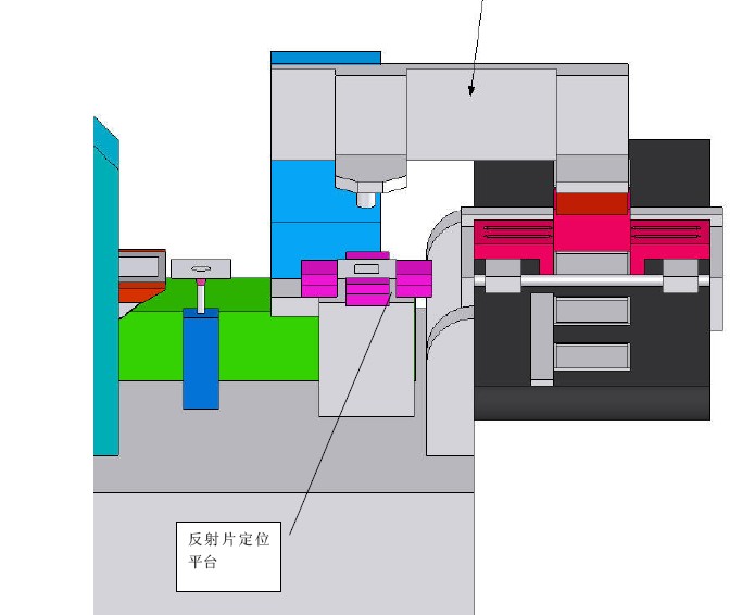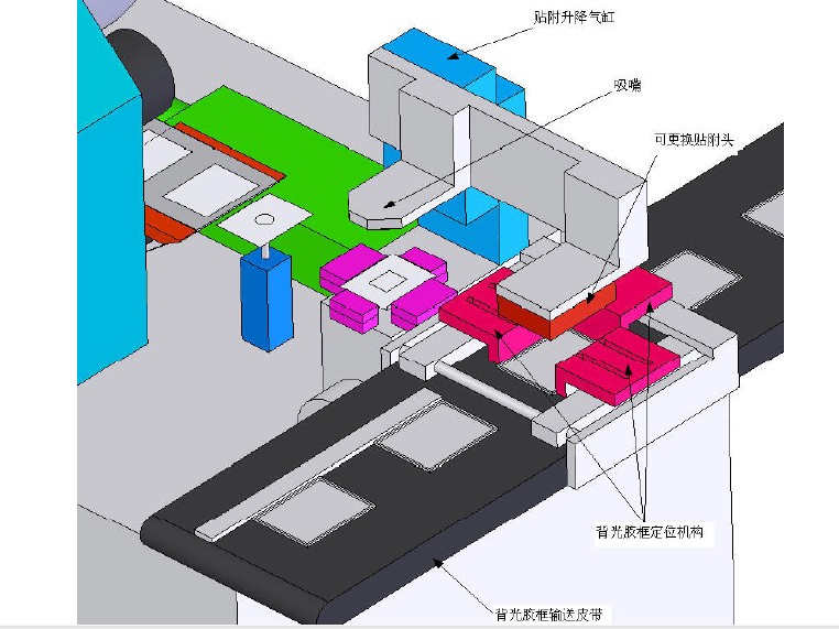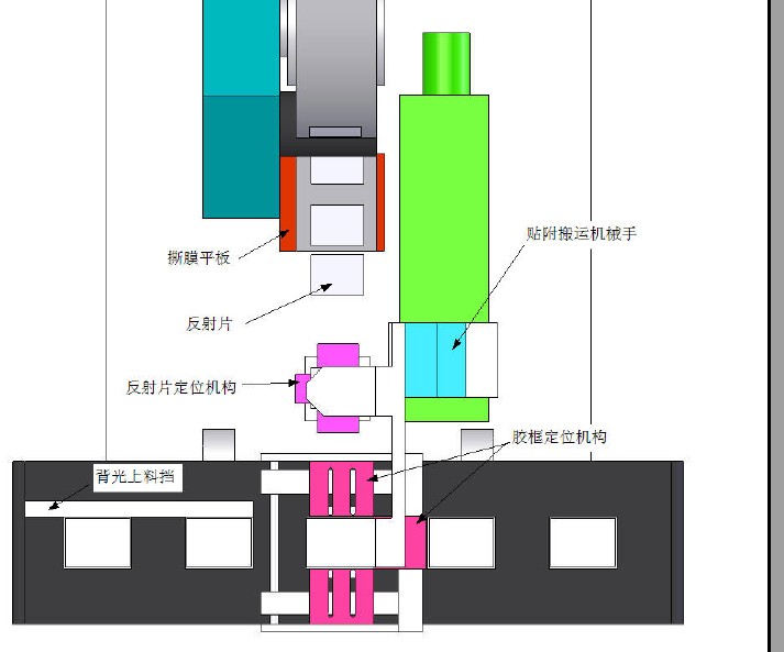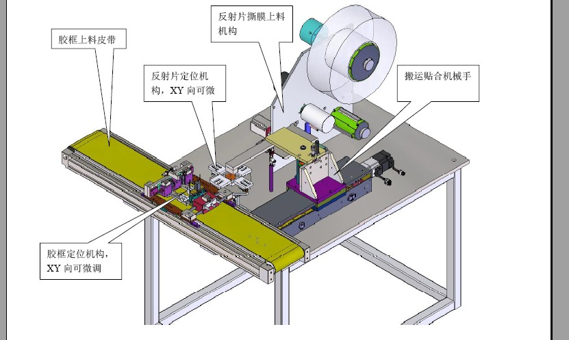 外有個減速機送膠框。輸送帶上的膠框定好位后等侍定好位的反射片用伺服取來后進行貼合動作。