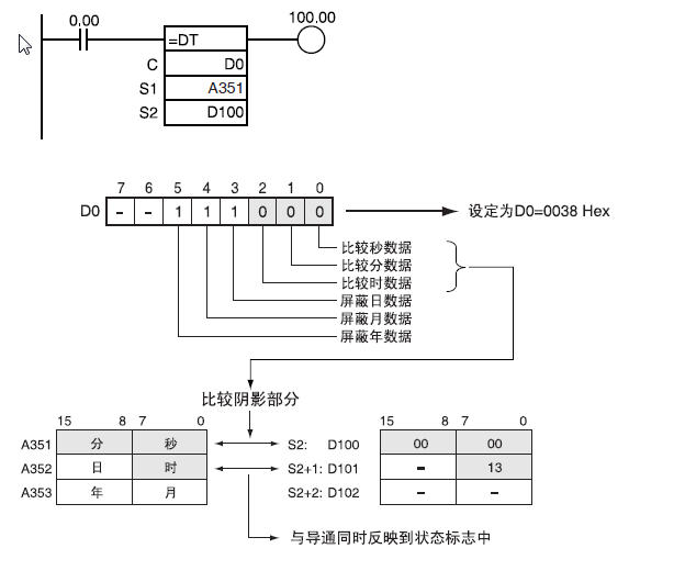 D100中輸入了29,而D101中輸入了1106,控制字選用了7,也就是屏蔽了秒,分,時(shí)的比較。