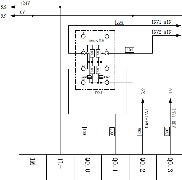 這是一種用離散觸點輸出模擬電壓給變頻器的簡易電路,圖中能控制兩臺變頻器,不是樓主所說的INV1和INV2之間的電壓,INV1和INV2之間的電壓對控制毫無意義!具體實現(xiàn)方法是用PWM指令輸出可變占空比的脈沖,進而可以調(diào)整電壓的高低。圖中理論上可以輸出0---12V的“階梯”電壓,再經(jīng)電容平滑濾波,但是速度響應會有一定的延遲(依電容大小而定)。此種電路一般應用在簡易的控制中,優(yōu)點是省去了D/A轉換模塊,節(jié)約了成本。