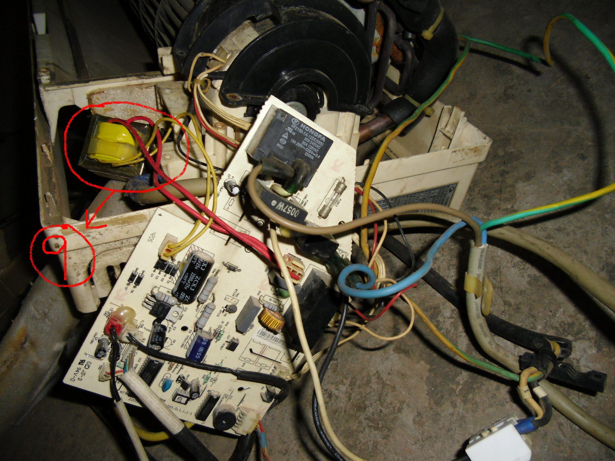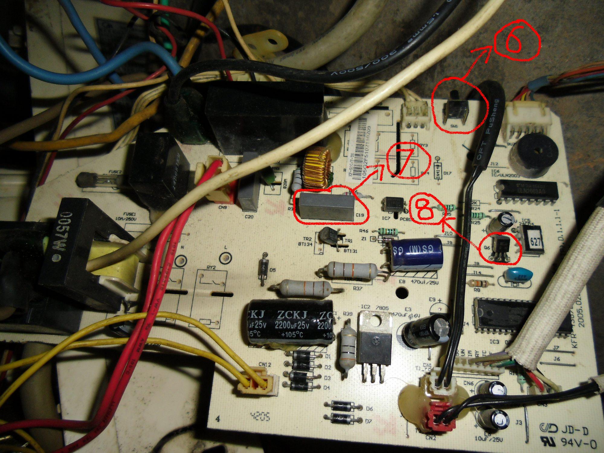 1、感溫探頭。2、是信號插頭。3、電機是調(diào)速,有高、中、低檔,所以線有5根。4、壓縮機繼電器。5、電感器。6、是手動開關。7、安規(guī)電容,濾除高頻干擾用。8、三極管。9,是變壓器。僅供參考。 |