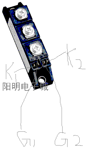 這是一個由兩個單向大功率可控硅并聯(lián)的模塊,K1、K2是和輸出端直通的,G1、G2分別是兩個可控硅的控制極,變頻器的主電源回路部分用的較多,主要作用是防止變頻器上點瞬間過電流引起空開跳閘,有些變頻器是用接觸器代替這一部份。