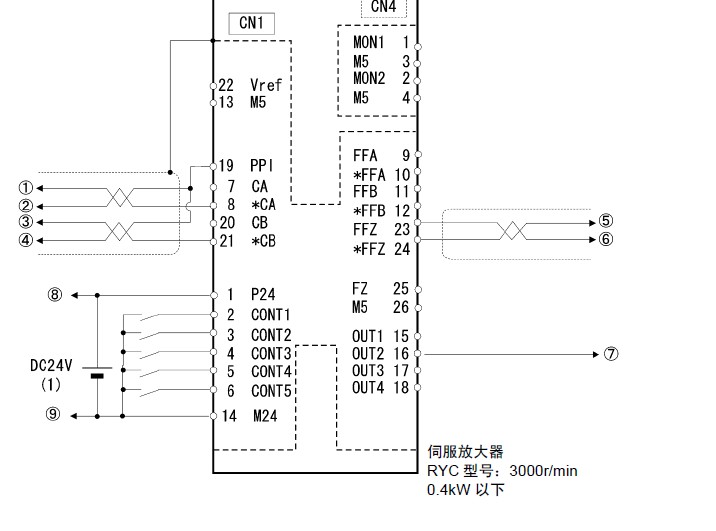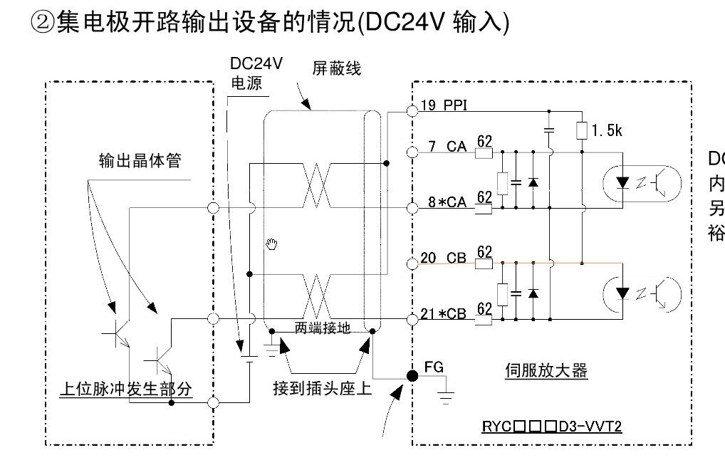 富士的伺服和電腦485通信,試運(yùn)行沒(méi)有問(wèn)題了,下一步用西門(mén)子的200的PLC發(fā)脈沖,看看伺服能運(yùn)行嗎,大家看我上面的接線,是不是該串2K的電阻上去啊,手冊(cè)也沒(méi)介紹可以接受5V還是24V的信號(hào)。