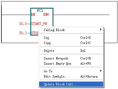 在其他程序中如果已經(jīng)調(diào)用了該塊,那么該塊的框圖會(huì)變成紅色,用右鍵更新功能塊就會(huì)顯示更新后的接口。
