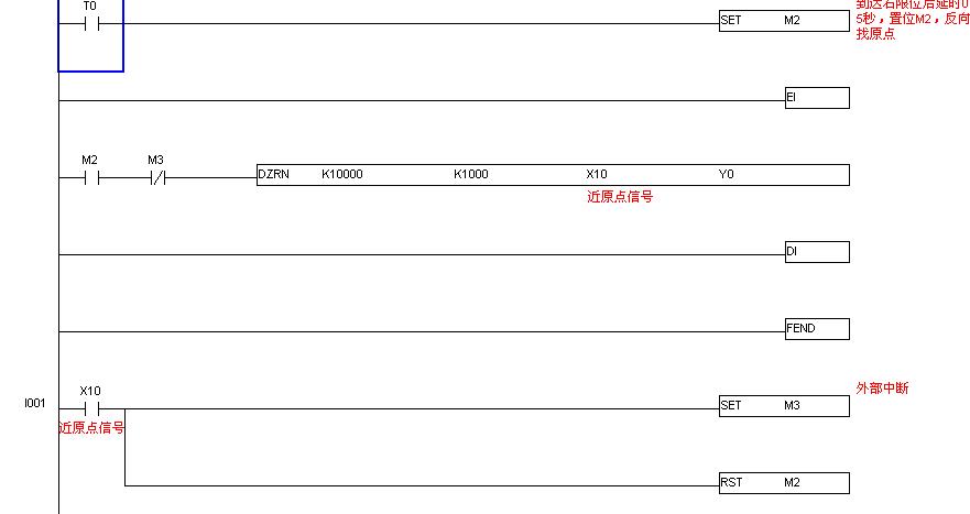 在X10為ON后,檢測(cè)到Z信號(hào)X0上升沿時(shí),置位M3,使電機(jī)停止運(yùn)轉(zhuǎn),此時(shí)認(rèn)為是原點(diǎn)