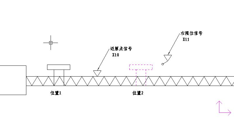 機(jī)械位置如圖所示,無論滑塊是在圖中的位置1還是位置2,均讓伺服電機(jī)正轉(zhuǎn)向右行走,直到接觸到右限位開關(guān),(此處也可以用相對(duì)定位指令,無論在何處均發(fā)一固定數(shù)目的脈沖向右行走,保證能走到近點(diǎn)開關(guān)的右側(cè)),延時(shí)0.5秒后啟動(dòng)原點(diǎn)回歸指令,中斷允許,以600R/分的速度向左行走,到達(dá)近點(diǎn)開關(guān)后以60轉(zhuǎn)/分的寸動(dòng)速度行走(擋板的長(zhǎng)度超過絲杠的最小螺距,保證在X10為OFF前找到Z信號(hào))。