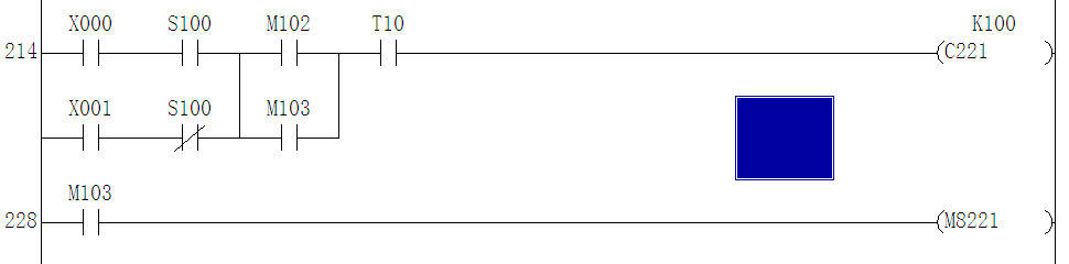 狀態(tài)繼電器S100不論是OFF還是ON ,X0與M102、X1與M103任何一組接通,并且T10在ON的情況下,C221計(jì)數(shù)器計(jì)數(shù)(計(jì)到100)。C221應(yīng)該是高速計(jì)數(shù)器,M8221是特殊功能繼電器,它是與高速計(jì)數(shù)器配合的,不知你這PLC是三菱哪個(gè)型號(hào)的,你查一下PLC的操作手冊(cè),在手冊(cè)的后面幾頁(yè)把這些特殊功能繼電器的作用都寫得很清楚的。