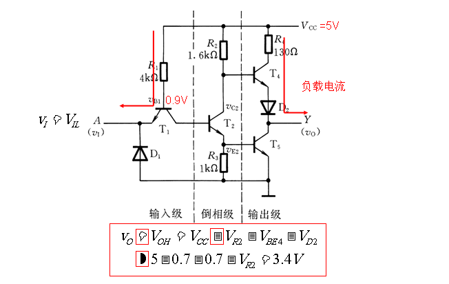 Vcc是表示電源5V電壓,V0表示地,也就是電源負(fù)極;VR2為3.4V,表示R2兩端壓降為3.4V;VBE4是指T4三極管基極與發(fā)射極的飽和導(dǎo)通電壓為0.7V;VD2是指二極管D2兩端的導(dǎo)通電壓為0.7V;V0-VH(U1)為信號(hào)電壓輸入端;V0-VOUT(UO)為信號(hào)輸出端。此電路當(dāng)?shù)瓜鄻OT2導(dǎo)通后,T4及T5導(dǎo)通后,對(duì)輸出負(fù)載Y進(jìn)行鉗位,使輸出為低電平,負(fù)載電流取決于R4的阻值大小。