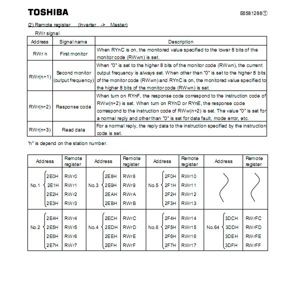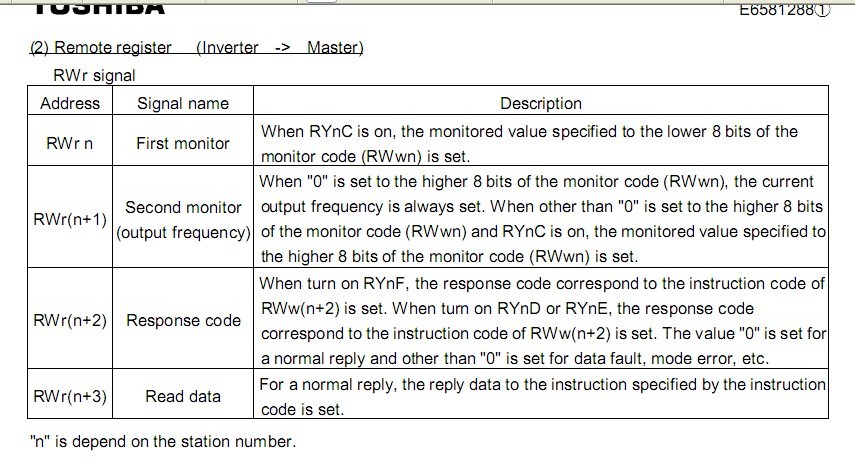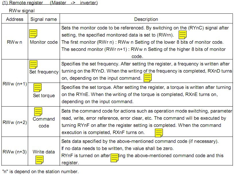 RWwn 監(jiān)視代碼,設(shè)置涉及(參考?)到的監(jiān)視代碼(對(duì)變頻器而言可以使頻率,電流,電壓以及各個(gè)參數(shù))。接通RYnC后,指定的監(jiān)視數(shù)據(jù)傳輸(設(shè)置)到RWrn。