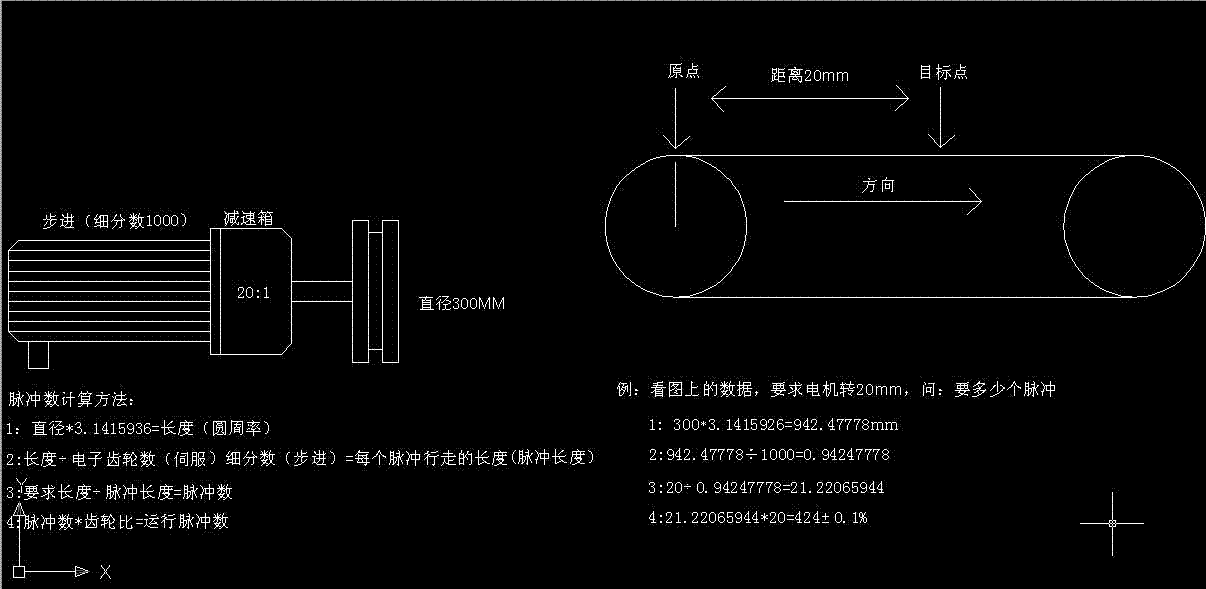 首先 有你的一米除以螺距5MM  也就是說1米需要螺桿轉動200圈 乘以減速比 就得到 電機需要轉動3000轉 然后編碼器裝在電機末端 電機轉一圈 是返回1024個脈沖 3000*1024就是1米總共返回的脈沖數(shù) S=(L/D)*i*n  其中 L是所走長度 D是螺距 I是減速比 N編碼器線數(shù) S為一定長度所返回的脈沖數(shù)
