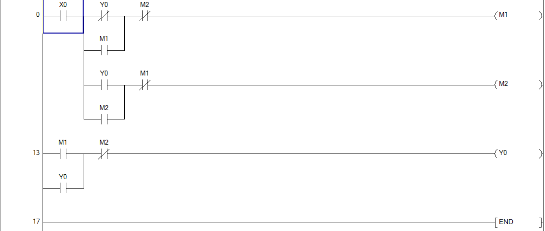 X0=按鈕   M1 M2 Y0 表示繼電器     燈由Y0 繼電器 控制