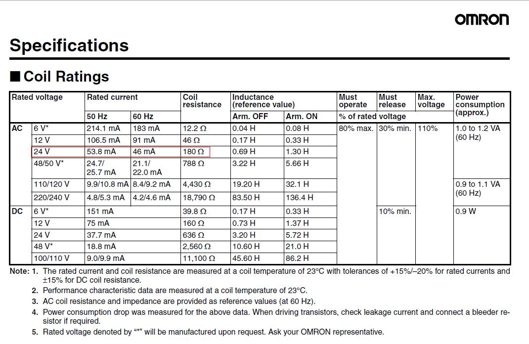 這里以O(shè)MRON交流24V繼電器為例,來說明一下。在沒有24V直流繼電器的情況下,用一個交流24V的繼電器代替。從查詢OMRON的繼電器資料可知,如圖:交流24V從實物繼電器的標(biāo)注上可以看出,然后用萬用表測量其線圈電阻也在180Ω左右,和圖中紅框的信息相對應(yīng),其工作電流為(50Hz)53.8mA。