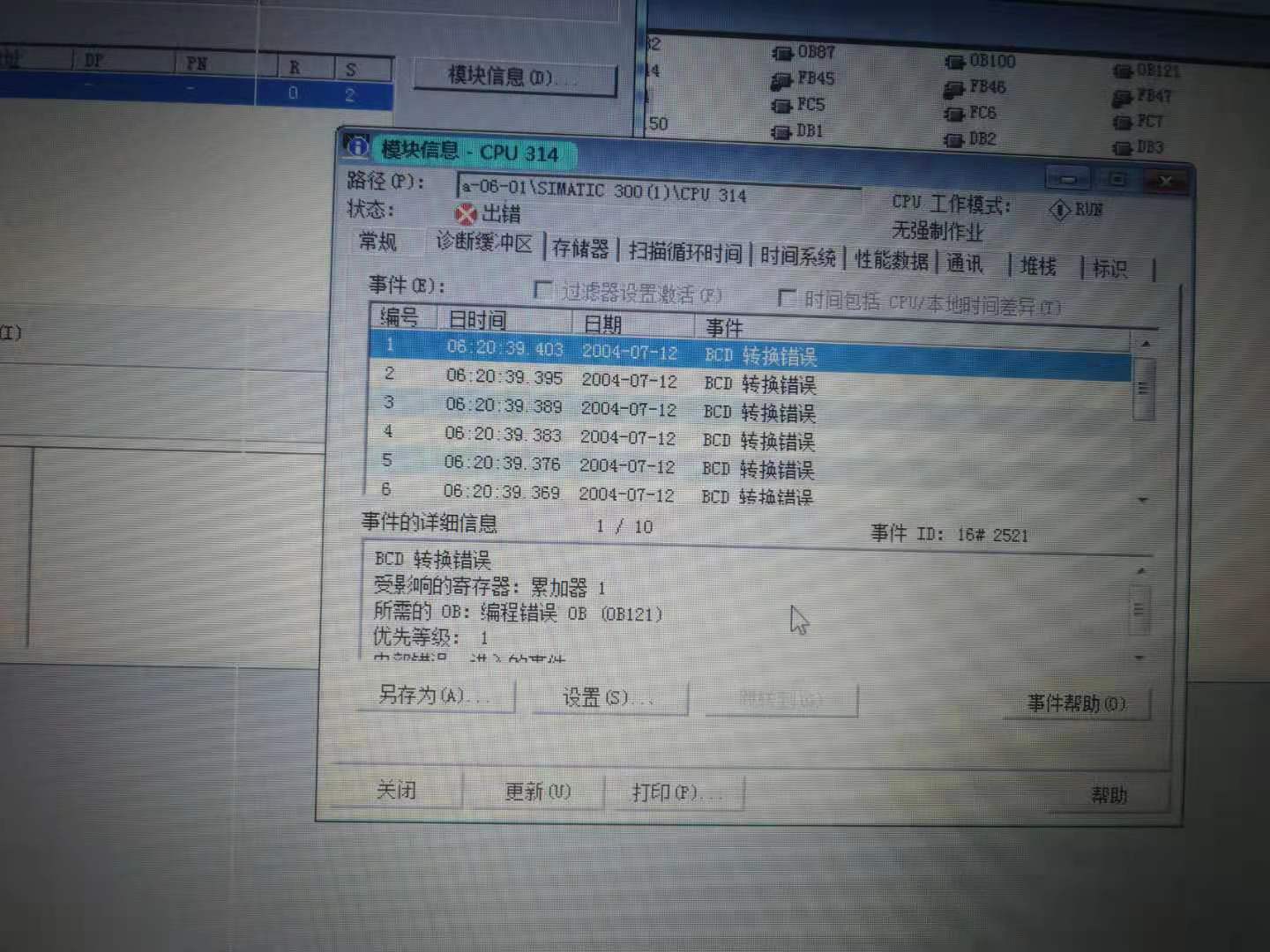 故障現(xiàn)象:CPU  314   的SF燈顯示紅色,通過在線診斷緩沖區(qū)檢測提示BCD轉(zhuǎn)換錯(cuò)誤。