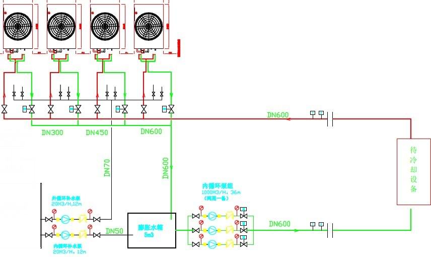 另外管道加有機(jī)械式流量控制閥,由4臺(tái)冷卻塔對(duì)循環(huán)水降溫,每臺(tái)塔出水口有一個(gè)電動(dòng)閥。