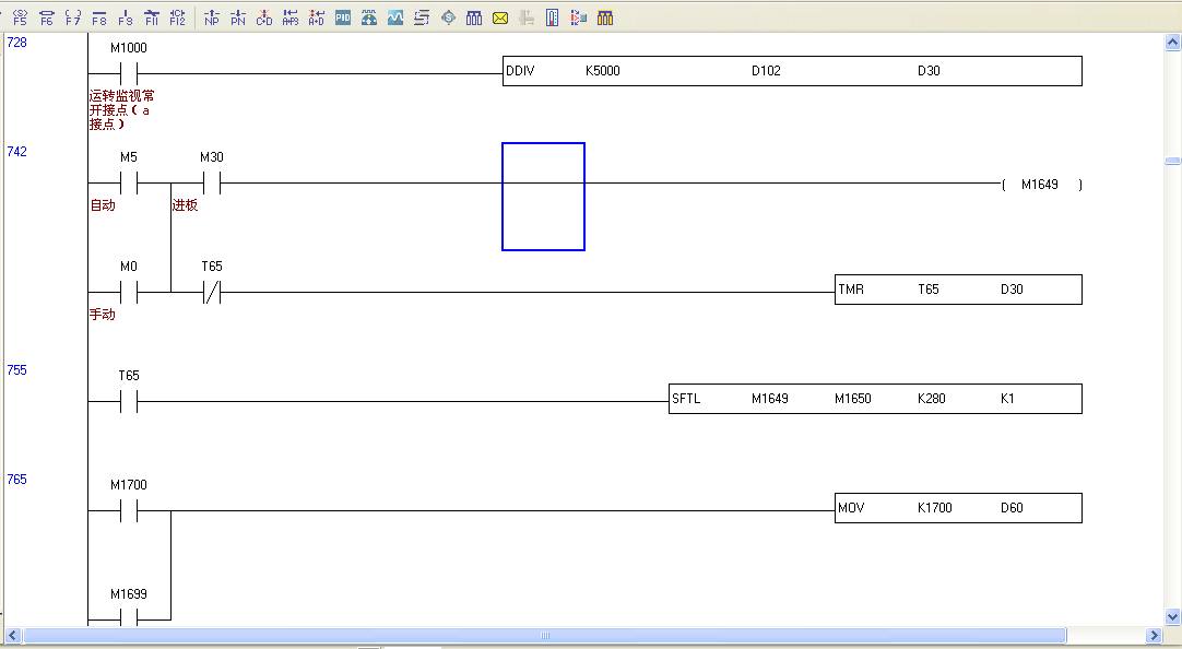 如圖,一個(gè)移位程序;從M1649開始,中間段固定位置開啟電磁閥。。D102:輸送變頻器頻率