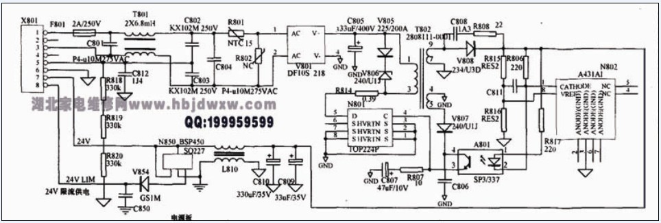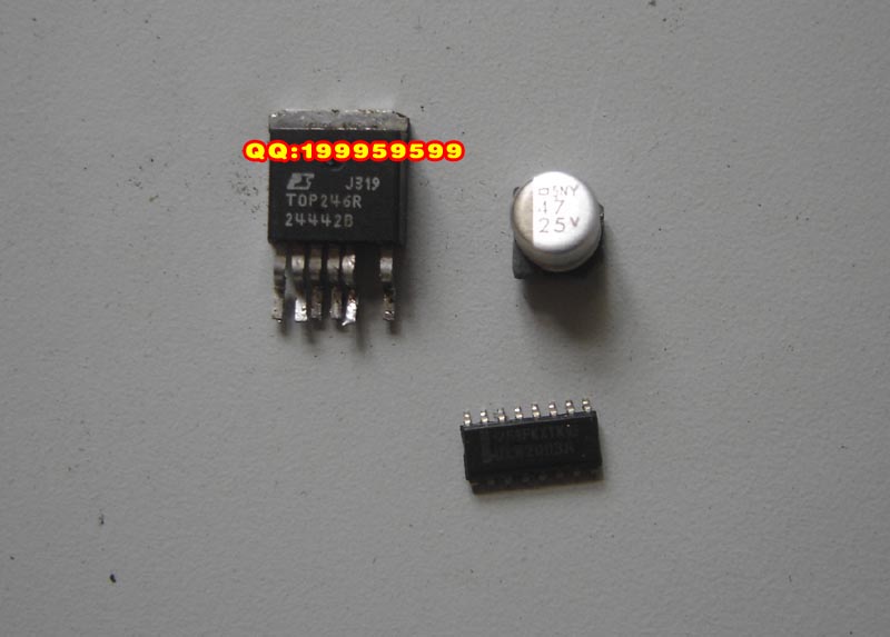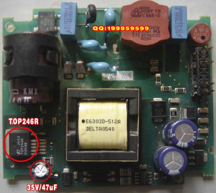 找到電源板,檢查電源管TOP246R, C腳無(wú)輸出。更換TOP246R。 檢查電容25V/47uF,容量不足,用普通35V/47uF電容代換。