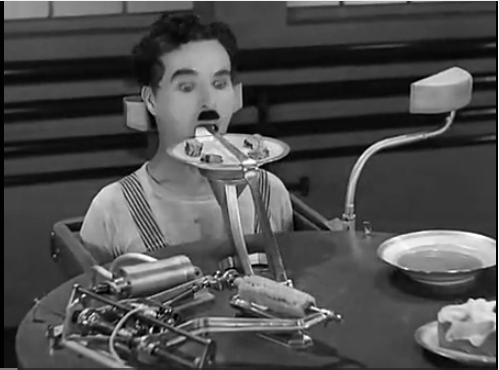 卓別林 的 摩登時代 就已經有自動喂飯機了