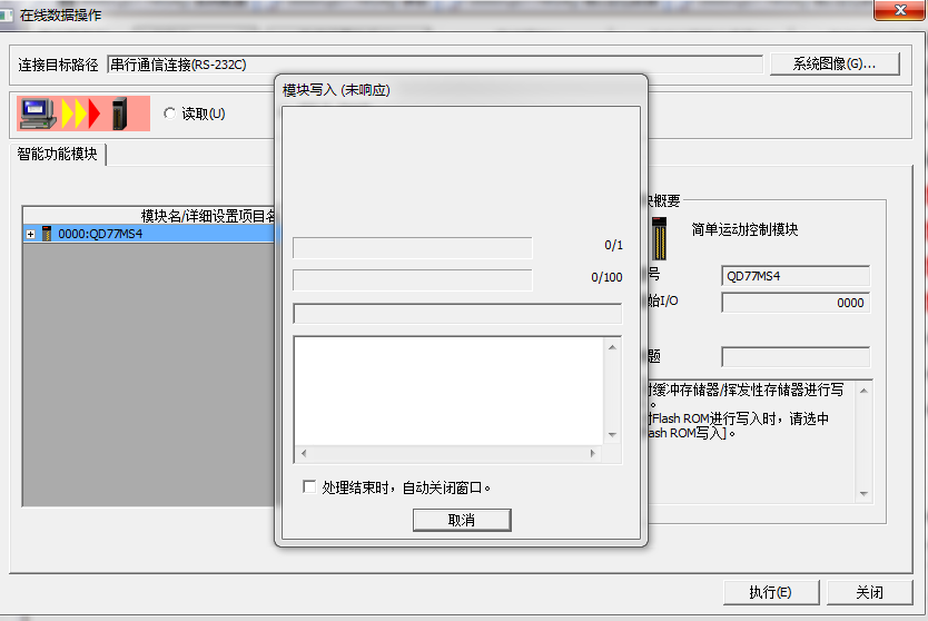 系統(tǒng)是WIN7 64位的 我在用GXworks軟件進(jìn)行定位模塊的數(shù)據(jù)傳輸時(shí)老是會(huì)顯示 通訊中斷, ![]() ![]() 可是到了53%以后就停住不動(dòng)了,過一會(huì)就會(huì)顯示傳輸失敗 ![]() 求解。 設(shè)備正在調(diào)試,很急啊。讀取文件可以的,就只有傳輸這個(gè)QD77的定位模塊出現(xiàn)這個(gè)問題。軟件卸載重新安裝過還是這樣。 CPU是Q01U的,本想用它的USB插口,可是不知道電腦設(shè)備為什么會(huì)老是顯示我沒有安裝驅(qū)動(dòng)。所以無法用USB通訊。(驅(qū)動(dòng)精靈和驅(qū)動(dòng)人生都嘗試過無法解決) |