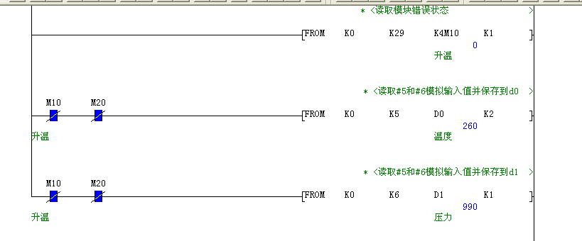 PLC是三菱fx2n 32mr的模擬量轉(zhuǎn)換模塊是4AD與4DA。 壓力變送器是順來達的SLDYB-2088量程為-0.1~0 電流輸入為4~20ma;溫度變送器用的是導(dǎo)軌式溫度變送器量程0~100攝氏度電流輸入為4~20ma分度號是pt100。
