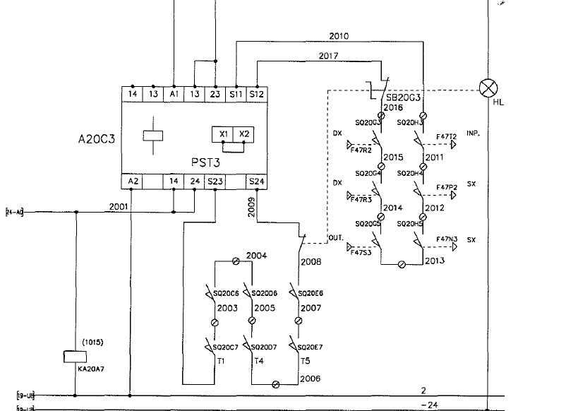 這個是一個意大利進口設備的圖紙上面的。沒有看見這個東西的實物。分析原理圖,這個東西 應該是把一系列的行程開關串并聯(lián),滿足條件后動作自身的繼電器的這樣一個東西。