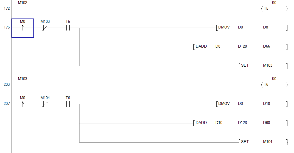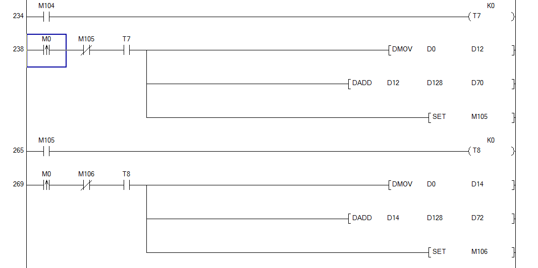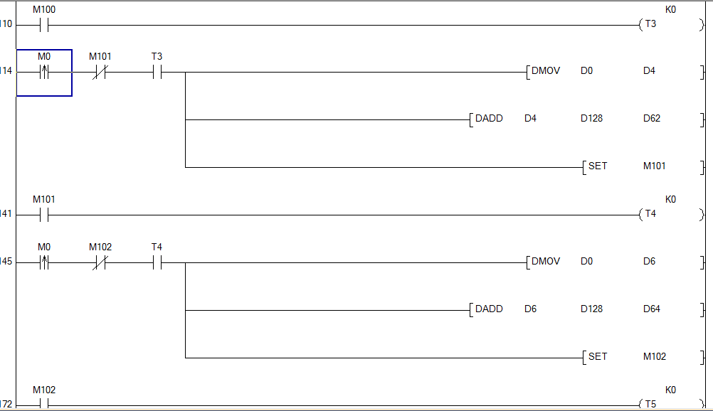 先工藝有兩道工序 ,第二工位受第一工位控制,當第一工位有產品(感應器檢測)延遲一定時間T,到達第二工位,第二道工序動作;目前編寫的程序可以實現,但是第二工位會出現遺漏,程序如下,現考慮用SFTR指令 哪位大神有做過類似的,麻煩給點思路,謝謝。LC三菱的
