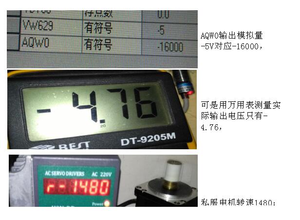 求助 AQW0輸出模擬量 -5V對(duì)應(yīng)-16000,可是用萬(wàn)用表測(cè)量實(shí)際輸出電壓只有-4.76,私服電機(jī)轉(zhuǎn)速1480;輸入5V對(duì)應(yīng)模擬量是16000,實(shí)際測(cè)得有時(shí)4.96V,有時(shí)5.01V,私服電機(jī)轉(zhuǎn)速1539。具體可以看圖。這樣情況怎么調(diào)整呢.