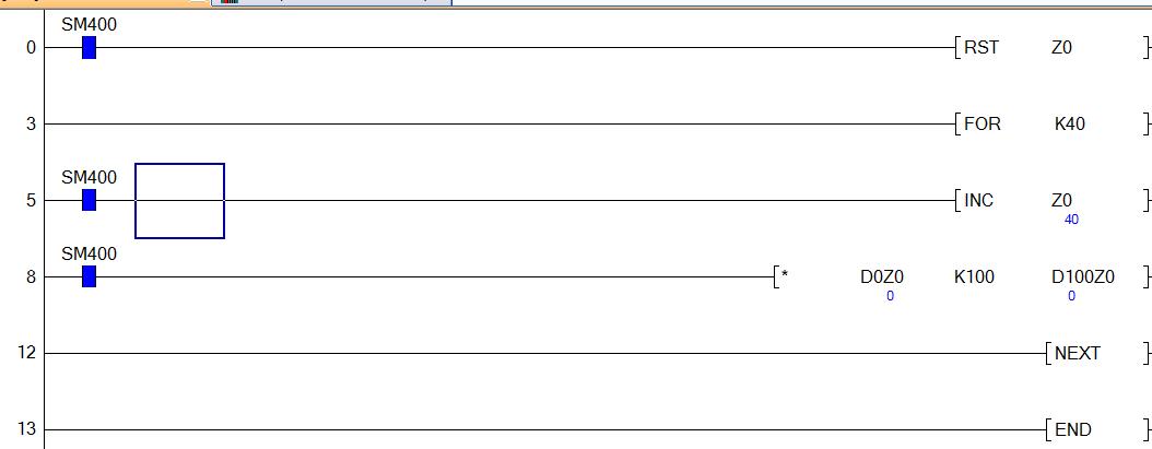 首先,您無法完成40個16位寄存器乘以100后存放到40個寄存器中,因為三菱中,16位數(shù)據(jù)乘法的結(jié)果為32位,因此您需要80個寄存器來存放結(jié)果。