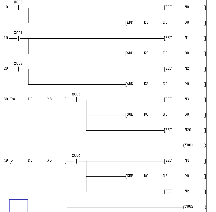 例如,X0,X1,X2實(shí)現(xiàn)D0的增加;X4,X5實(shí)現(xiàn)D0的減法。但只是通過給Y0不同的脈沖個數(shù),來控制單個數(shù)碼管顯示D0里面的內(nèi)容?