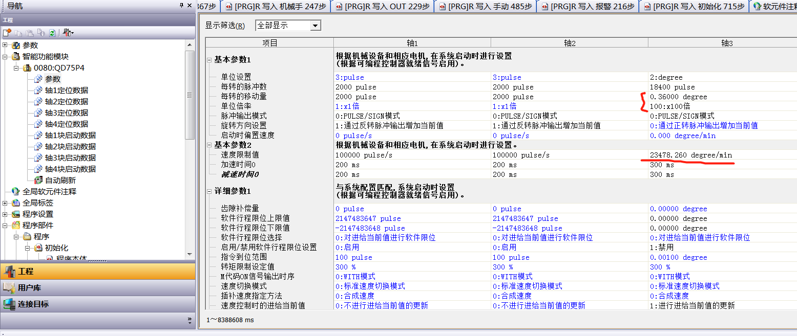 給你個圖片參考,每轉(zhuǎn)移動量和每轉(zhuǎn)脈沖以及倍率之間沒關(guān)聯(lián)好,最大速度是由這三個參數(shù)決定的。比如我的設定意思是0.36Deg  X 倍率100=36Deg=18400pls  ,  當指令給定移動量36000000時電機轉(zhuǎn)360Deg,旋轉(zhuǎn)電機編碼器的分辨率=184000