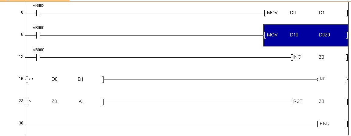 我的這幾行程序思路是將一個(gè)D10寄存器在當(dāng)前掃描周期傳送給D0,下一個(gè)掃描周期傳送給D1。同時(shí)在每個(gè)掃描周期比較D0與D1的值是否相同,如果不同就判斷是D10的值被修改,然后自動(dòng)執(zhí)行相應(yīng)的動(dòng)作,經(jīng)過(guò)測(cè)試有時(shí)可以,有時(shí)沒(méi)反應(yīng),難道是我的邏輯有問(wèn)題,請(qǐng)高手指點(diǎn)!謝謝!