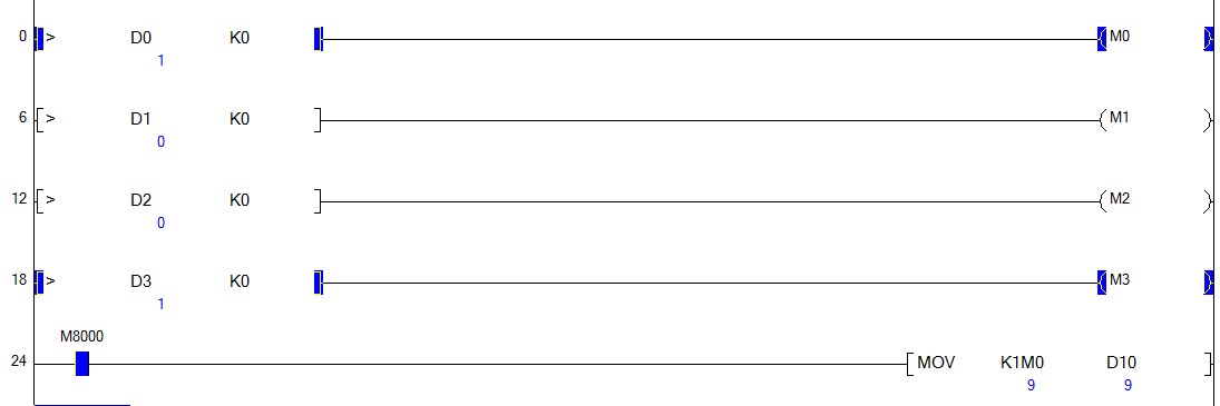 引用引用第7樓luelyzeng于2018-09-30 08:57發(fā)表的 :假如 4個連續(xù)的數(shù)字 D3 D2 D1 DO 那么你想要的結(jié)果是 D3*8 + D2*4 +D1*2 +D0*1 =D20 ,D20就是你想要的最終結(jié)果,用不了太多指令去轉(zhuǎn)來轉(zhuǎn)去,不信你試試!不用謝,請叫我雷鋒!