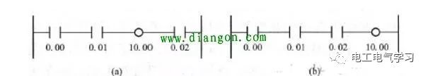 (2)梯形圖的每一行都是從左母線開始,線圈接在最右邊。觸點不能放在線圈的右邊,而在繼電接觸器控制電路中,觸點可以加在線圈的右邊,這在PLC的梯形圖中是不允許的。如圖1(a)表示。從圖中不難看出編程者的意圖是,當觸點0.00、0.01、0.02都閉合時,線圈10.00被驅動得電。但在梯形圖中由于觸點不能與右母線相連,因此將圖1(a)轉換成圖1(b)所示格式,既滿足了程序的上述功能,又符合梯形圖的編程規(guī)則。