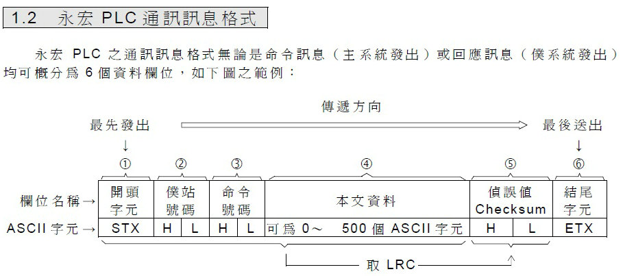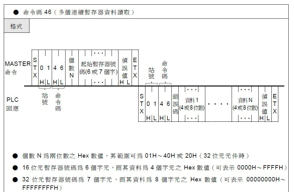 根據(jù)永宏的協(xié)議格式來,開頭:2 站號:01(PLC站號) 命令碼:46(讀取多個(gè)寄存器) 本文資料:????? 偵誤值:??? 結(jié)束:3