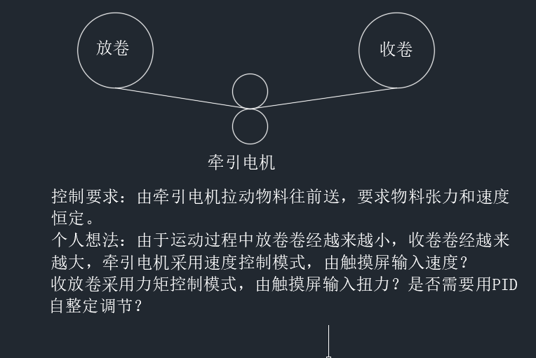 見過這種生產(chǎn)線,有成熟的標(biāo)準(zhǔn)漲力傳感器和漲力控制器,漲力控制器輸出信號(hào)給變頻器,自動(dòng)調(diào)節(jié)。不需要復(fù)雜的PLC編程,PLC只負(fù)責(zé)機(jī)械邏輯動(dòng)作。