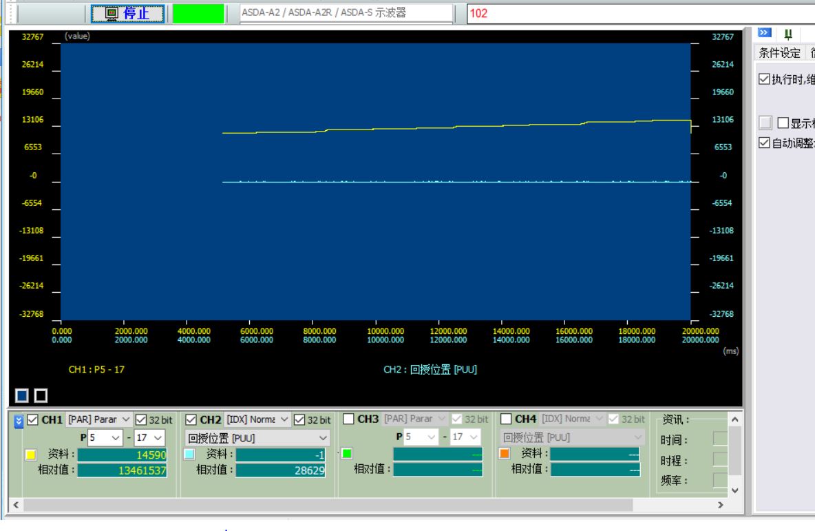 把P73改為300000 也是報這個,不知道是怎么回事?接線 :軸1 CN1 的 ;21 OA ; 22 /OA ; 25 OB ; 23 /OB 對應接到軸2 CN5 ; 4 OPT A ; 5 OPT/A ; 3 OPT B ; 2 OPT/B 另外一臺反之也是這樣接,用軟件示波器臨控 回授位置數(shù)據(jù)和P5-17 數(shù)據(jù)時不一樣相差很大,電機沒啟動P-17數(shù)據(jù)也一直在變動。把CN5接頭扒掉時就停了,還有那里要設置或接線的嗎?