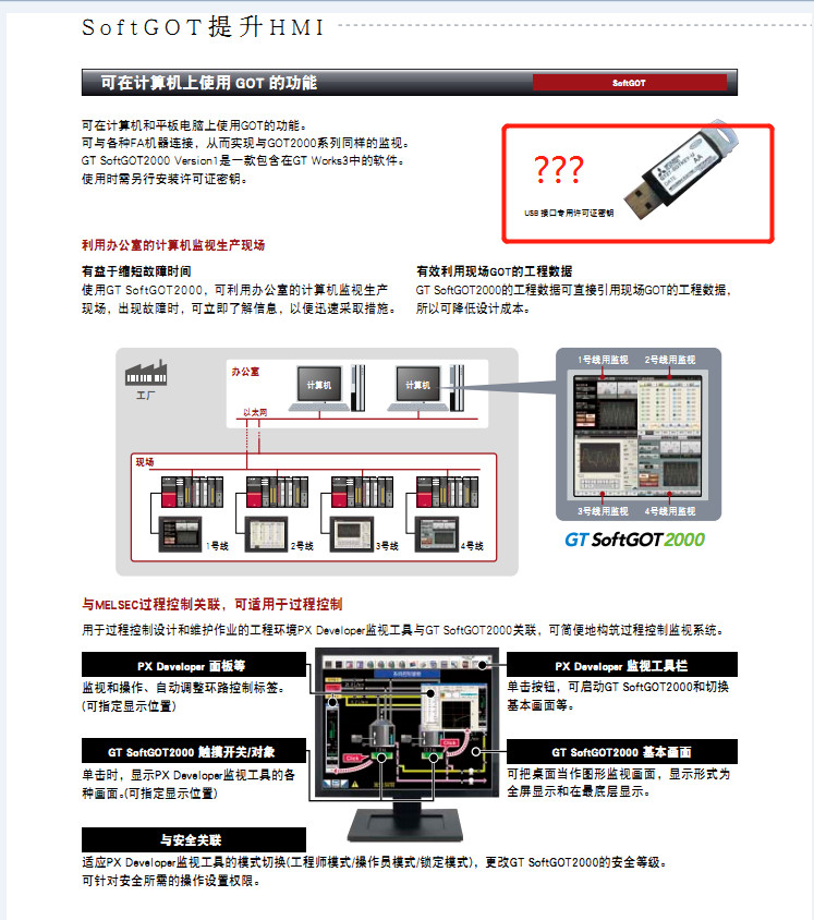 1、SoftGOT2000是用電腦代替GOT,實(shí)現(xiàn)遠(yuǎn)程監(jiān)控,需要使用USB密鑰。否則監(jiān)控時(shí)間不超過(guò)2小時(shí)。SoftGOT 使用簡(jiǎn)單,因?yàn)榈讓拥臇|西是廠商做好了的,但得出錢才能用。要想省錢,就要用C#、VC、VB編寫程序,調(diào)用MX commpont控件,讀寫PLC的數(shù)據(jù)。