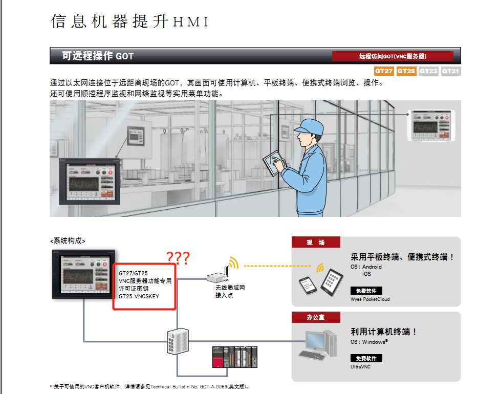 2、VNC (Virtual Network Console)是虛擬網(wǎng)絡(luò)控制臺(tái)的縮寫。由 AT&T 的歐洲研究實(shí)驗(yàn)室開發(fā)。VNC 是基于 UNIX 和 Linux 操作系統(tǒng)。GT25/27要想用于VNC,需要專用密鑰。不過(guò),目前國(guó)內(nèi)很少用。3、國(guó)內(nèi)現(xiàn)在用無(wú)線串口服務(wù)器,就能實(shí)現(xiàn)無(wú)線監(jiān)控。但是,無(wú)線通信在惡劣的工業(yè)環(huán)境中,抗電磁干擾、穩(wěn)定性等方面似乎解決得不太好。