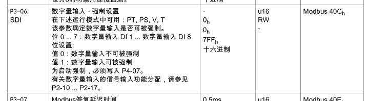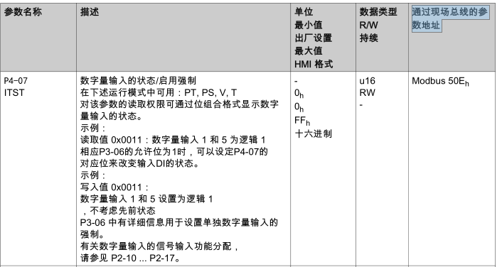 通過Modbus通訊,給P3-06(數(shù)字量輸入 - 強(qiáng)制設(shè)置)寫入1,P4-07(數(shù)字量輸入的狀態(tài)/啟用強(qiáng)制)寫入1,啟動(dòng)伺服電機(jī);