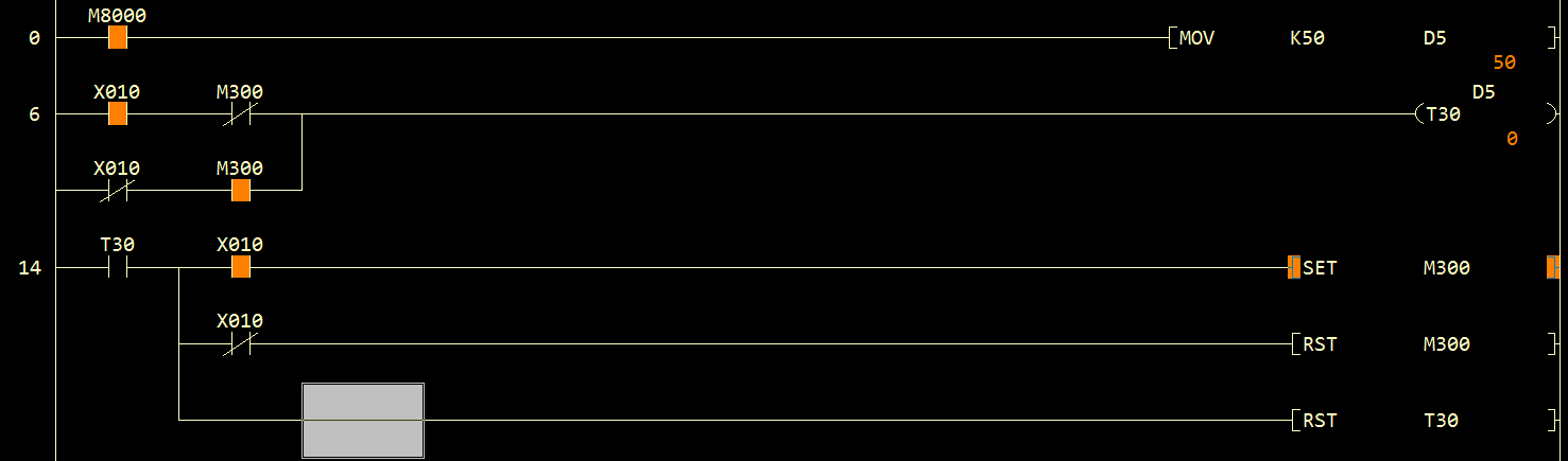 引用引用第9樓nightblueblu于2019-08-21 13:17發(fā)表的 :你這個信號的延時會導致某些動作的誤動作或者不靈敏,再說了,點位特別多的情況下很浪費定時器,或者說很多點都延時的話整體延時就很厲害直接寫成下面的就行,無論怎樣閃,取最早感應到的上升沿或下降沿-----------|X0|---------↑--------|M0常閉|-----------[SET M0]-----------|X1|---------↓--------|M0常開|-----------[RST M0]