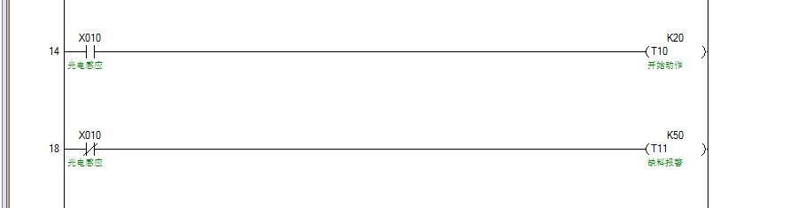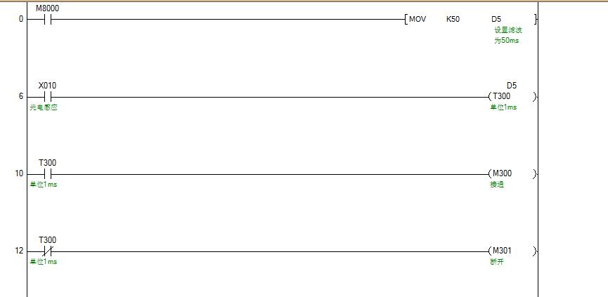 引用引用樓主夢雨天涯于2019-08-20 16:43發(fā)表的 三菱FX系列怎么寫光電感應的濾波 :你們的光電感應是這樣濾波的嗎?防止一閃一閃,既沒有達成動作條件,也沒有達成報警條件,就需要加濾波
