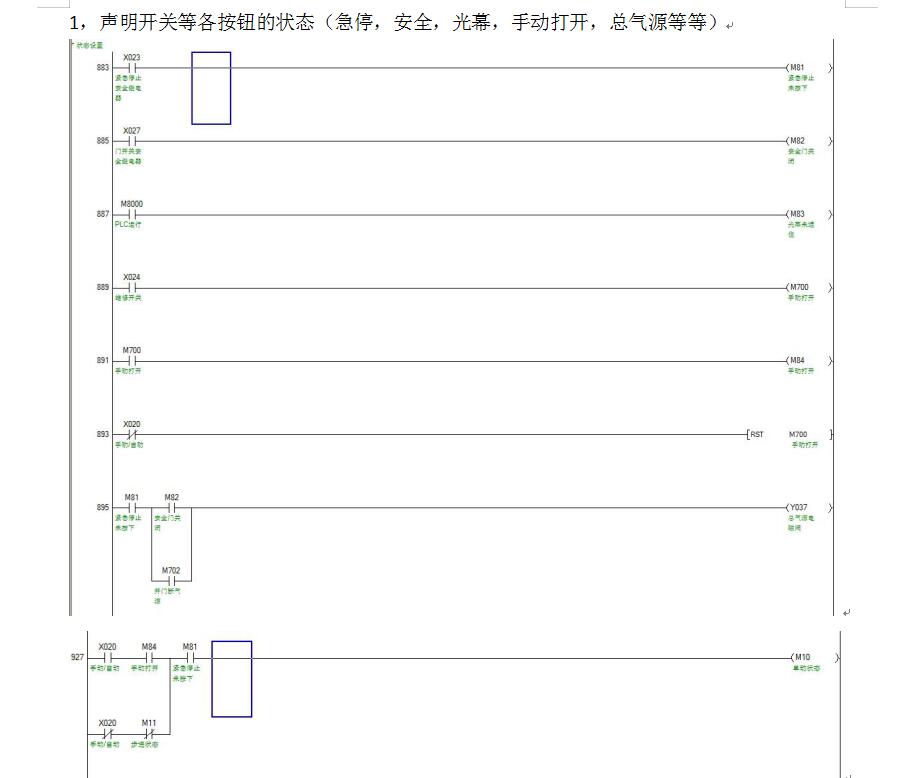 ![]() 1,聲明開關(guān)等各按鈕的狀態(tài)(急停,安全,光幕,手動(dòng)打開,總氣源等等) 2,寫步進(jìn)流程,可省略(選擇工位時(shí)候,按一下啟動(dòng),進(jìn)行一個(gè)動(dòng)作) 3,寫復(fù)位各個(gè)狀態(tài),完成后的接通的繼電器(用于檢測(cè)是否復(fù)位完成和停機(jī)使用) 4,寫復(fù)位調(diào)教和過(guò)程(配合各個(gè)工位是否復(fù)位完成) 5各個(gè)寫狀態(tài)(自動(dòng)等待狀態(tài),停機(jī)不清料模式,停機(jī)清料模式,自動(dòng)運(yùn)行模式) 6停機(jī)模式(含清料) 7,動(dòng)作 (1)振動(dòng)盤寫法,先寫各感應(yīng)延時(shí)(含缺料振動(dòng)盤不停止) (2)吹氣一次和長(zhǎng)按吹氣 (3)送錫手動(dòng)(快慢,正反)和送錫一次 (4)氣缸簡(jiǎn)單寫法 (5)一個(gè)工位動(dòng)作完整流程 A請(qǐng)確認(rèn)工位是否關(guān)閉,如果關(guān)閉,直接完成當(dāng)前工位 B寫出當(dāng)前工位相關(guān)氣缸的前后位延時(shí) C寫當(dāng)前氣缸的動(dòng)作(記得把氣缸前后位延時(shí)加進(jìn)去) D當(dāng)前工位完成后,下一個(gè)轉(zhuǎn)盤動(dòng)作完成前,消除它的完成動(dòng)作 8,產(chǎn)量計(jì)算(含合格產(chǎn)量,總產(chǎn)量,單班產(chǎn)量,節(jié)拍,產(chǎn)能) 9各個(gè)狀態(tài)的時(shí)間(運(yùn)行,故障,停機(jī)) 9,寫三色燈(含觸摸屏對(duì)應(yīng)的狀態(tài)燈,防止三色燈壞了,看不到) 10復(fù)位狀態(tài)未完成,輸出各個(gè)報(bào)警 11報(bào)警 (1)安全報(bào)警(急停,安全門,光幕,手動(dòng)打開) (2)缺料報(bào)警 (3)設(shè)置錯(cuò)誤報(bào)警(無(wú)需復(fù)位) (4)溫控器報(bào)警(無(wú)需復(fù)位) (5)伺服極限報(bào)警(無(wú)需復(fù)位) (6)氣缸報(bào)警(單,雙頭電磁閥) (7)連續(xù)測(cè)量不合格報(bào)警(報(bào)警復(fù)位后,繼續(xù)運(yùn)行) (8)工位未完成,超時(shí)報(bào)警(提示) (9)開機(jī)彈窗,請(qǐng)選擇產(chǎn)品型號(hào)(提示) 最后,不要問(wèn)我為什么不發(fā)程序…… |