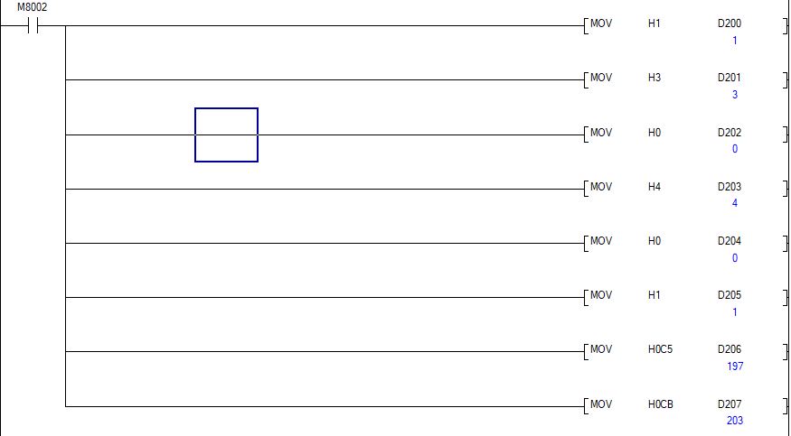 PLC發(fā)送RS程序:M8000 RS D200 K8 D100 K7