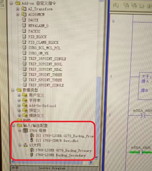 有一套AB的compactlogix的L33ER系統(tǒng),冗余的CPU是通過1769-SDN的DeviceNet模塊下掛兩個從站的I/O模塊的,如圖2,但是在使用RSLogix5000系統(tǒng)上傳程序時,發(fā)現(xiàn)程序文件的硬件結(jié)構(gòu)中沒有這些DeviceNet模塊的信息,如圖1紅圈處,是軟件安裝中缺少什么組件嗎,導(dǎo)致這些DeviceNet的設(shè)備上傳不上來,請AB的高手說說,要怎么才能將其上傳,謝謝!~