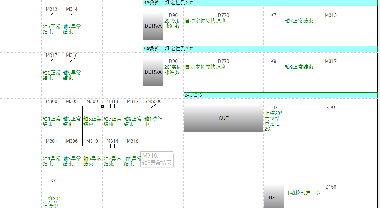 這臺(tái)設(shè)備由10個(gè)軸輸出, 10個(gè)同時(shí)輸出,然后完了同時(shí)執(zhí)行下一個(gè)動(dòng)作,我是用10條定位指令的正常結(jié)束ON 穿起來然后延時(shí)觸發(fā)下一條指令,請(qǐng)問用過的師傅指點(diǎn)下這樣可不可行? FX5U的定位指令前面的驅(qū)動(dòng)條件不斷開的時(shí)候,定位完成信號(hào)會(huì)不會(huì)一直保持輸出直到驅(qū)動(dòng)條件斷開? 還是跟3U一樣是瞬時(shí)的接通?,懂的師傅指點(diǎn)下,萬謝!