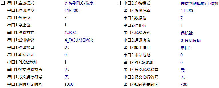 IGT-SER系列智能網(wǎng)關(guān)的串口1連接PLC,串口2連接觸摸屏,智能網(wǎng)關(guān)模塊的相關(guān)參數(shù)設(shè)置如下: