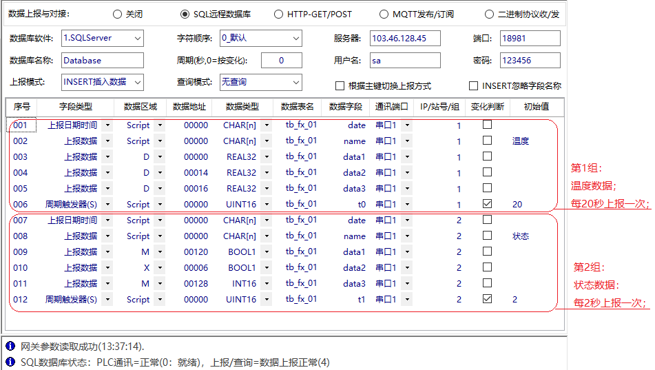 IGT-SER系列智能網(wǎng)關(guān)模塊,支持各種PLC、智能儀表、遠(yuǎn)程IO與數(shù)據(jù)庫之間雙向通訊,既可以讀取設(shè)備的數(shù)據(jù)上報(bào)到SQL數(shù)據(jù)庫,也可以從數(shù)據(jù)庫查詢數(shù)據(jù)后寫入到設(shè)備;數(shù)據(jù)庫軟件支持MySQL、SQLServer、PostgreSQL。相關(guān)軟件和手冊在附件中。