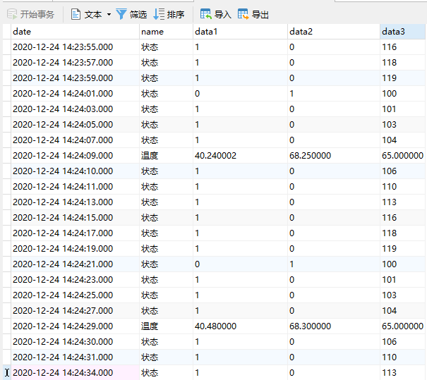 參數(shù)設(shè)置完成后通過‘參數(shù)’->‘參數(shù)寫入到網(wǎng)關(guān)’將參數(shù)寫入到網(wǎng)關(guān)模塊,‘工具’->‘重啟網(wǎng)關(guān)’,然后‘參數(shù)’->‘從網(wǎng)關(guān)讀取參數(shù)’,在狀態(tài)欄會顯示網(wǎng)關(guān)的狀態(tài);如果狀態(tài)正常,通過數(shù)據(jù)庫工具軟件Navicat連接數(shù)據(jù)庫,查看數(shù)據(jù)表中的數(shù)據(jù),如下圖: