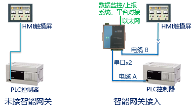 在PLC的通訊端口被觸摸屏占用時(shí),不用增加另外的通訊模塊,按照以下方式直接加入IGT-SER系列智能網(wǎng)關(guān)模塊,實(shí)現(xiàn)PLC與數(shù)據(jù)庫雙向通訊,具體原理如下: