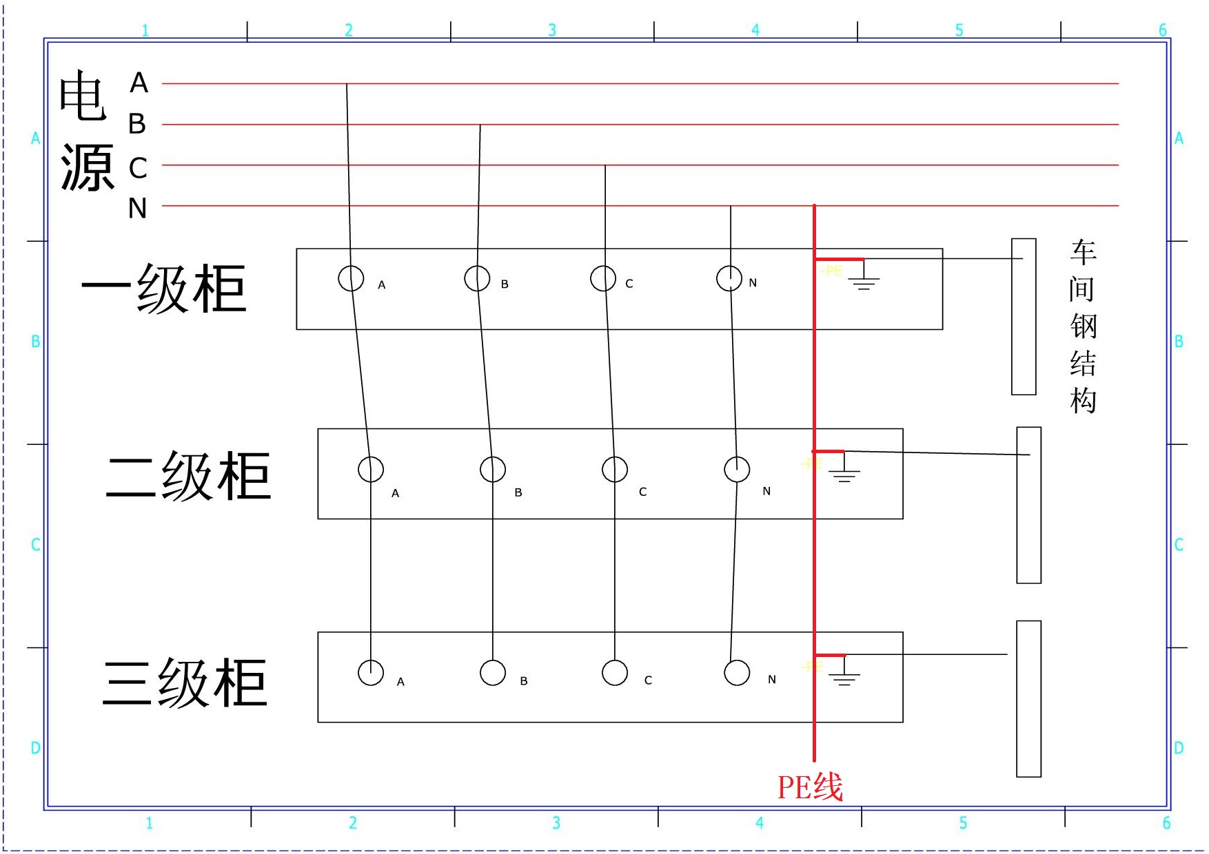 基本上從配電房到車(chē)間一級(jí)柜,二三級(jí)電箱,所使用的都是三相四線制,即只有零線,地線都是統(tǒng)一取自附近的廠房鋼柱子。
