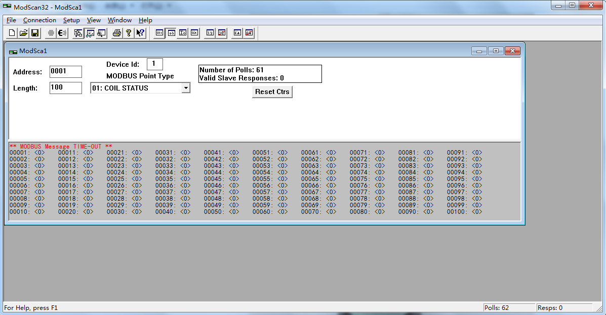 第一次使用串口調(diào)試軟件ModScan32,測(cè)試與ABB ACS550變頻器的通訊,總是顯示Modbus Message TIME-OUT,不知道是怎么回事,用過(guò)的朋友歡迎賜教